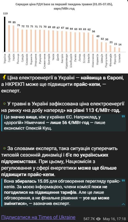 За словами економіста Олексія Куща, середня вартість на українському ринку електроенергії на добу вперед у травні досягла 113 євро за мегават-годину — цей показник перевищує ціни навіть у традиційно дорогих країнах, таких як Німеччина, де цей показник становив лише 56 євро/МВт-год.