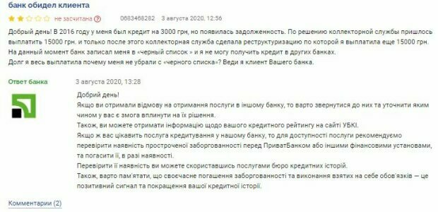 "На даний момент банк записав мене в« чорний список »і я не можу отримати кредит в інших банках. Борг я весь виплатила. Чому мене не прибрали з« чорного списку »? Адже я клієнт Вашого банку", - поскаржилася клієнтка.